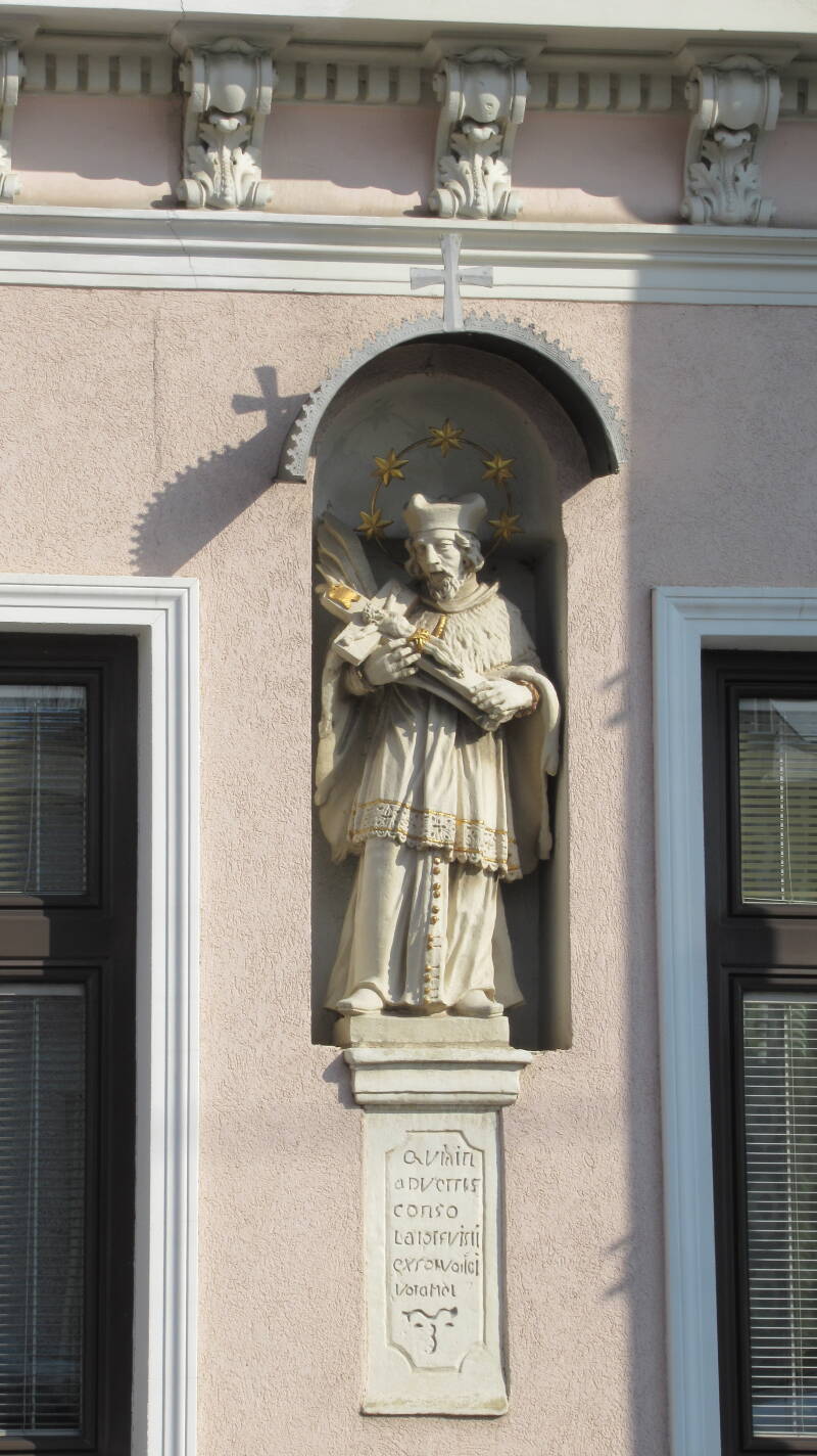 Der Heilige ist erkennbar an dem Kruzifix sowie den fünf Sternen am Heiligenschein und der Kleidung des Domkapitels von Prag, wo er die Funktion des Generalvikars des Erzbischofs bekleidete und von König Wenzels IV. Gattin als Beichtvater erwählt wurde, deren Beichtgeheimnis zu bewahren letzten Endes seinen Tod besiegeln sollte. [3]