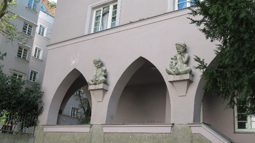 Die Blicke auf sich zieht vor allem auch der über zwei Geschoße ragende Durchgang in der Ehamgasse, der mit seinem kräftigen, geometrischen Fassadendekor [5] sowie den beiden Spitzerkern in Dreiecksform mit darüber liegenden Balkonen diesen Bereich dominiert. Dieses Gestaltungselement wird uns im Beitrag noch ein weiteres Mal begegnen.