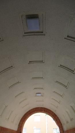 Detail der Fassade Ehamgasse 4 sowie die kassettierte Tonnendecke im Durchgang.
