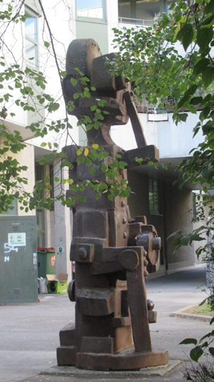 Ein in einem der Innenhöfe befindliches Kunstwerk „ohne Titel“ wurde von Karl Anton Wolf geschaffen und verweist mit Dreh- und Gelenkelementen auf den ehemaligen Standort der Waggonfabrik. [9]